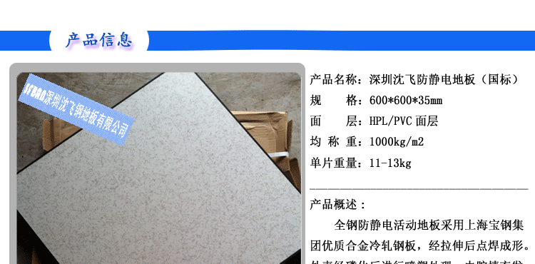 全鋼防靜電地板 【規格型號】 600×600×35mm 【產品概述】 全鋼防靜電活動地板采用上海寶鋼集團優質合金冷軋鋼板,經拉伸后點焊成形。外表經磷...