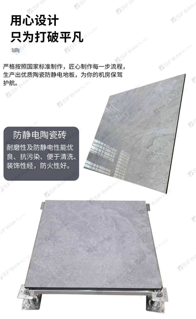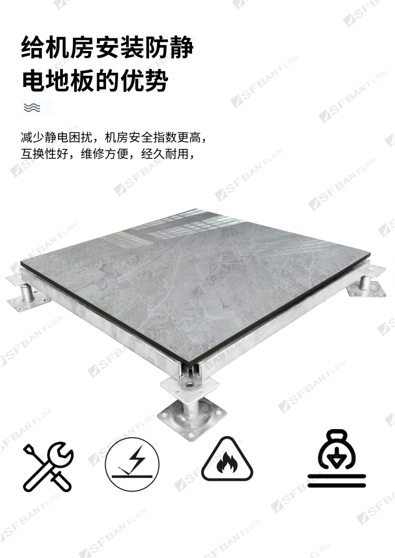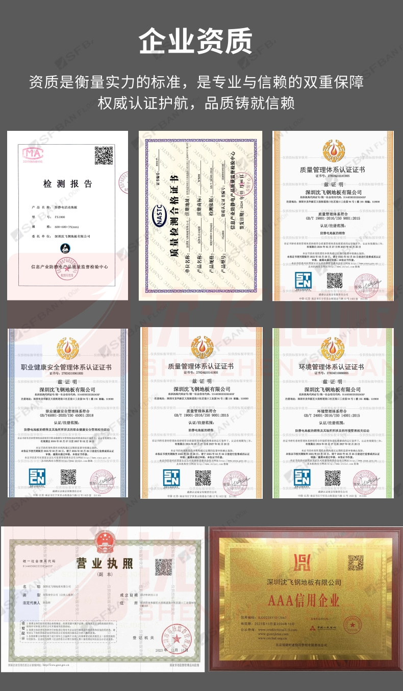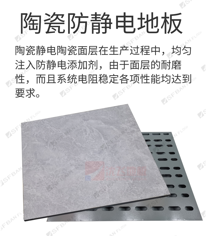 產品型號:FS1000 產品規格:600mm*600mm*38.5mm 產品面層:陶瓷面防火板 產品載荷:1000kg一平方