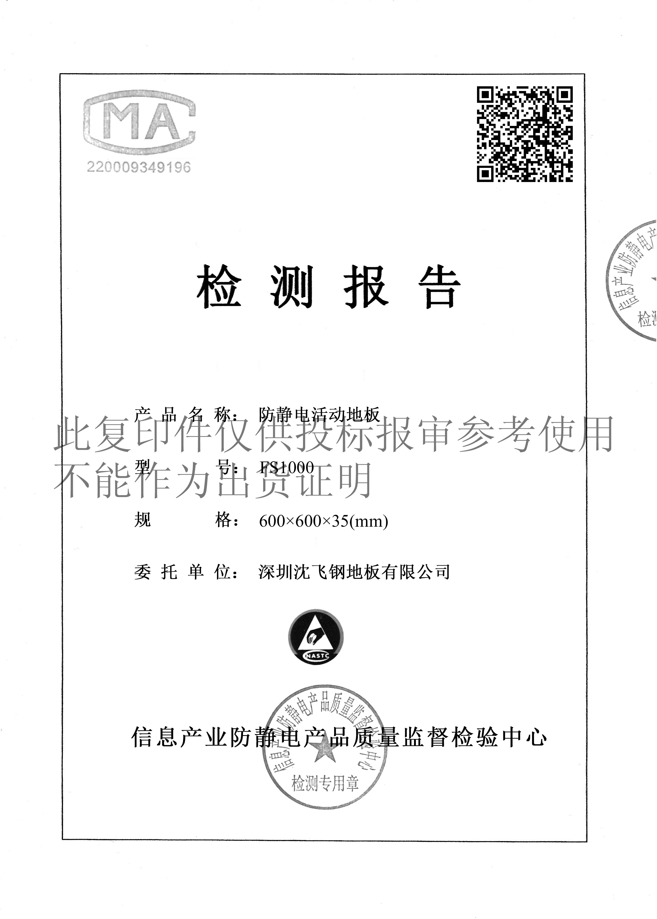 本公司防靜電地板產品通過GB/T 36340-2018標準,經檢測機構“信息產業防靜電產品質量監督檢驗中心”檢驗通過符合國家有關標準及要求。